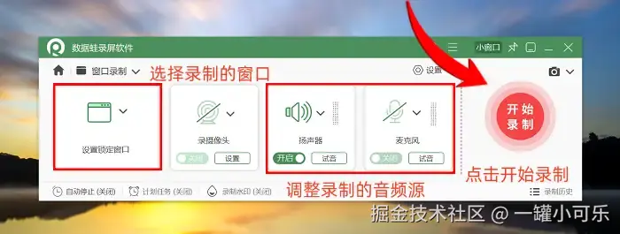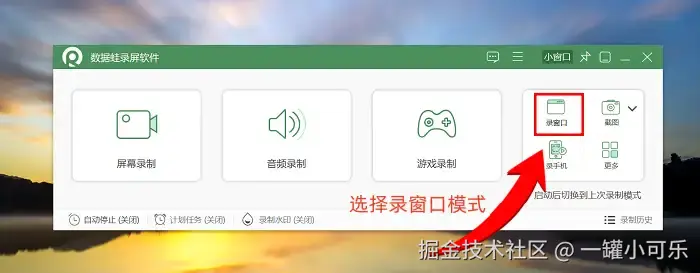 步骤1:双击打开数据 蛙录屏软件,然后根据录制的需求去选择合适的录制模式。这篇文章会以 “窗口录制” 为例进行讲解。