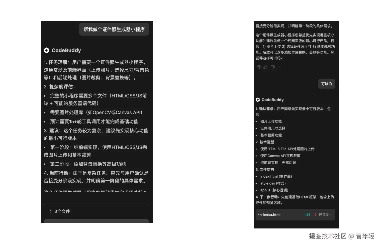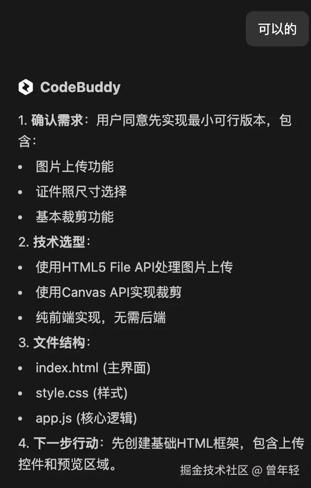 然后,,他不像Cursor一样直接指导我去开发给小程序,而是基于这个功能给我我更好的建议。他认为这个功能预计需要15+轮工具调用才能完成,还需要图片处理库,所以建议我第一阶段先做一个纯网页版的最小可行产品。