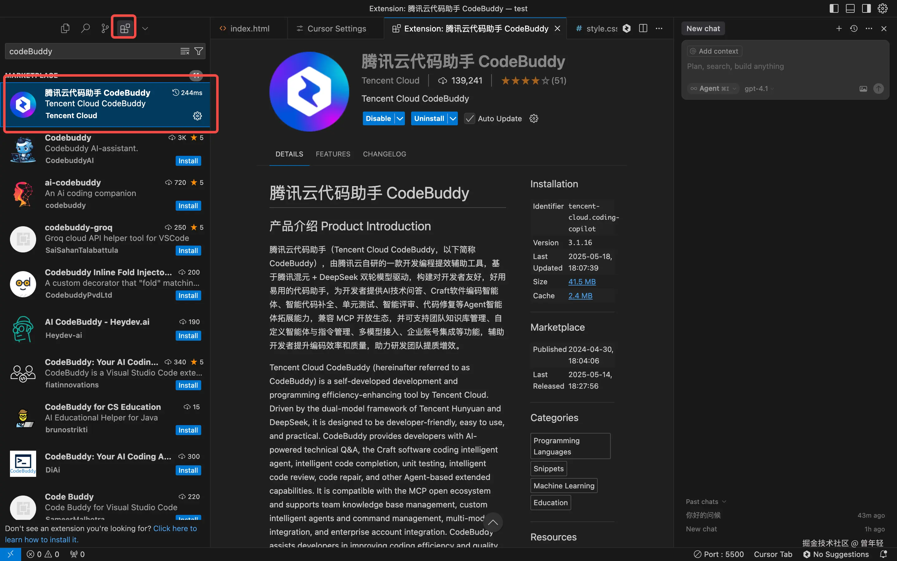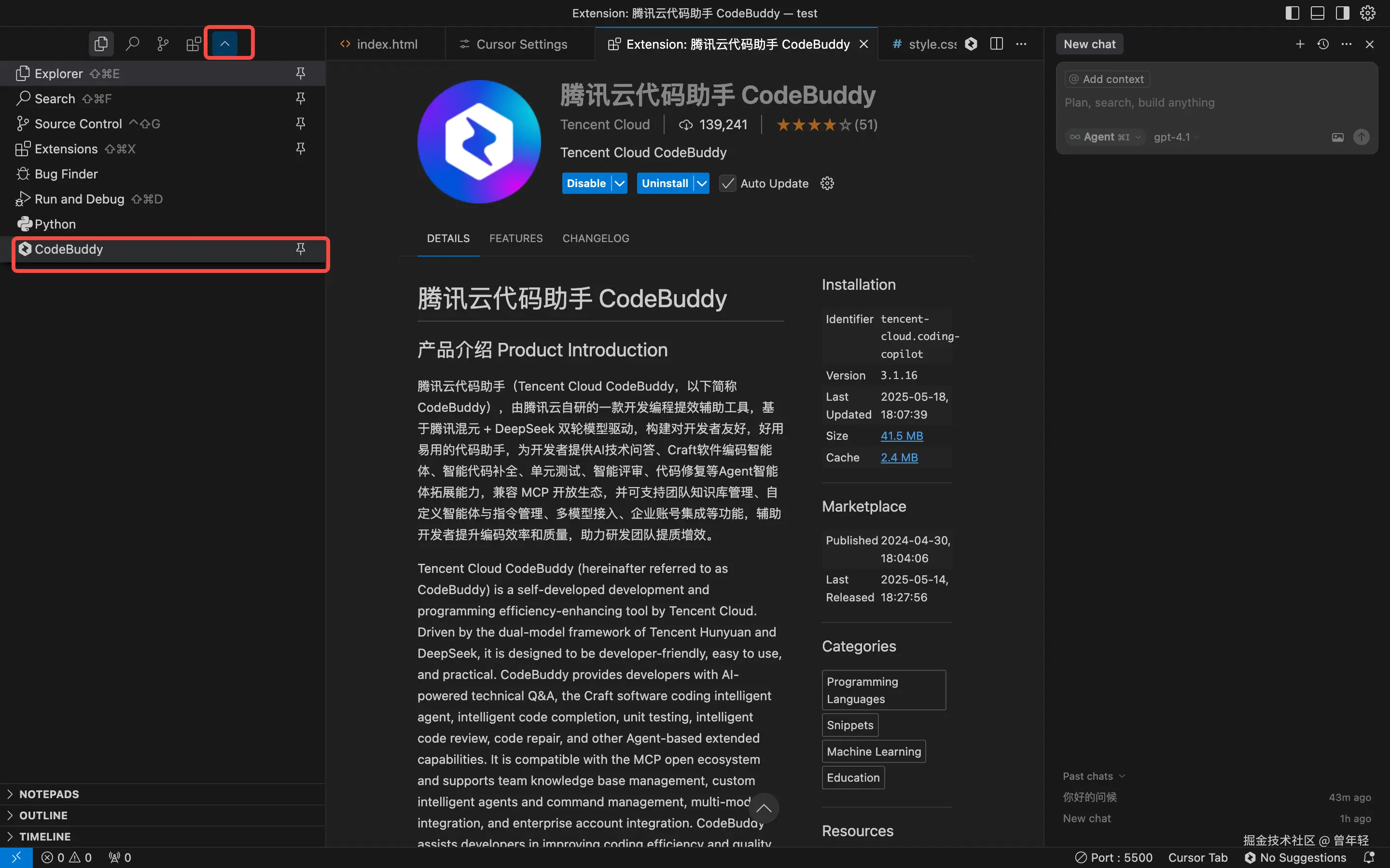 那么,如果你在用Cursor的话,将CodeBuddy揣进Cursor的兜里,一个工具同时具备两大AI编程工具的能力,两者可以同时修改代码,切换着用,那这是一个非常不错的解决方案。