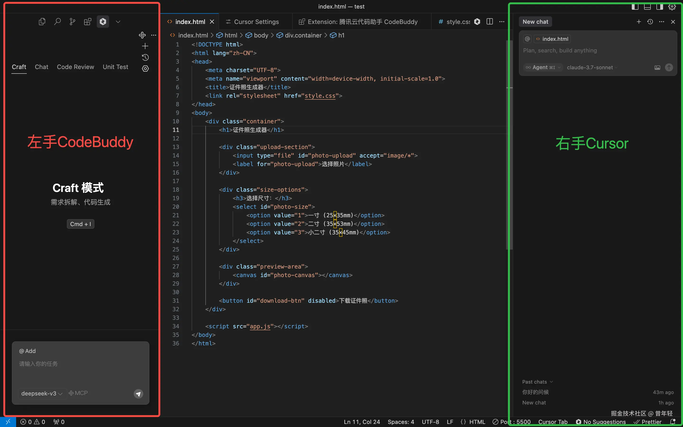 至此,艺术已成。左手国内CodeBuddy,右手国外Cursor。左手国内DeepSeek V3,右手国外Cluade-3.7。