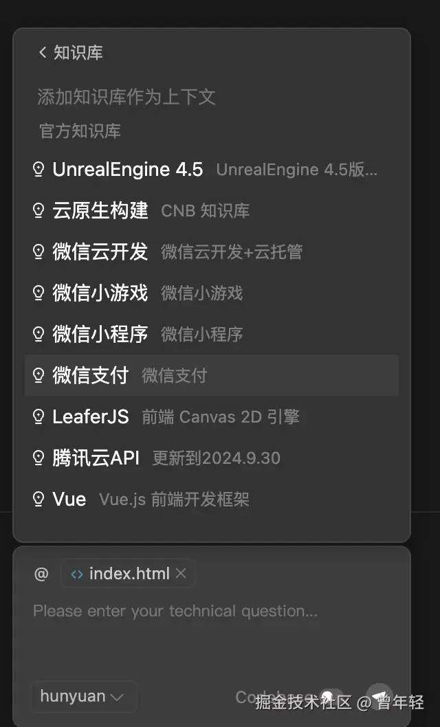 尤其是选择知识库的时候,纯天然的支持内置的微信小程序、微信支付、vue、React、Spring boot、TDensign等开发时常用的知识库,这点真的太赞了,不亏是国内的AI编程工具,为国人常用的开发习惯考虑。
