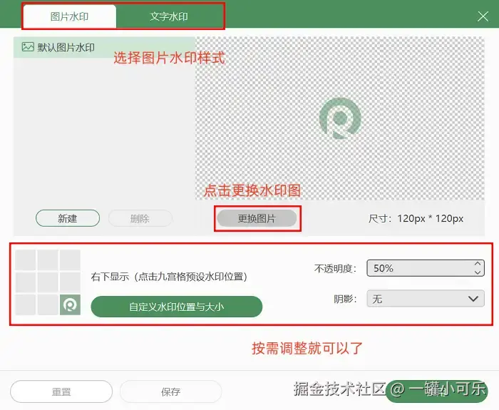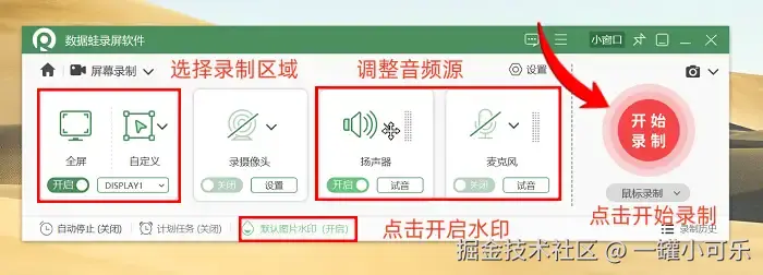 步骤2:进入屏幕录制模式后,我们可以自由框选出需要录制的区域,也别忘记选择好合适的音频源。如果你想给视频加上水印,就点击打开 “图片水印” 。全部设置好了之后,就可以点击 “开始录制” 录制视频了。