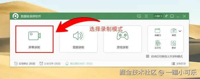 步骤1:屏幕录屏软件在哪里打开?点击打开数据 蛙录屏软件,在主页面中可以看到多种录制模式,如屏幕录制、游戏录制等,大家可以按需选择。我们以 “屏幕录制” 为例。