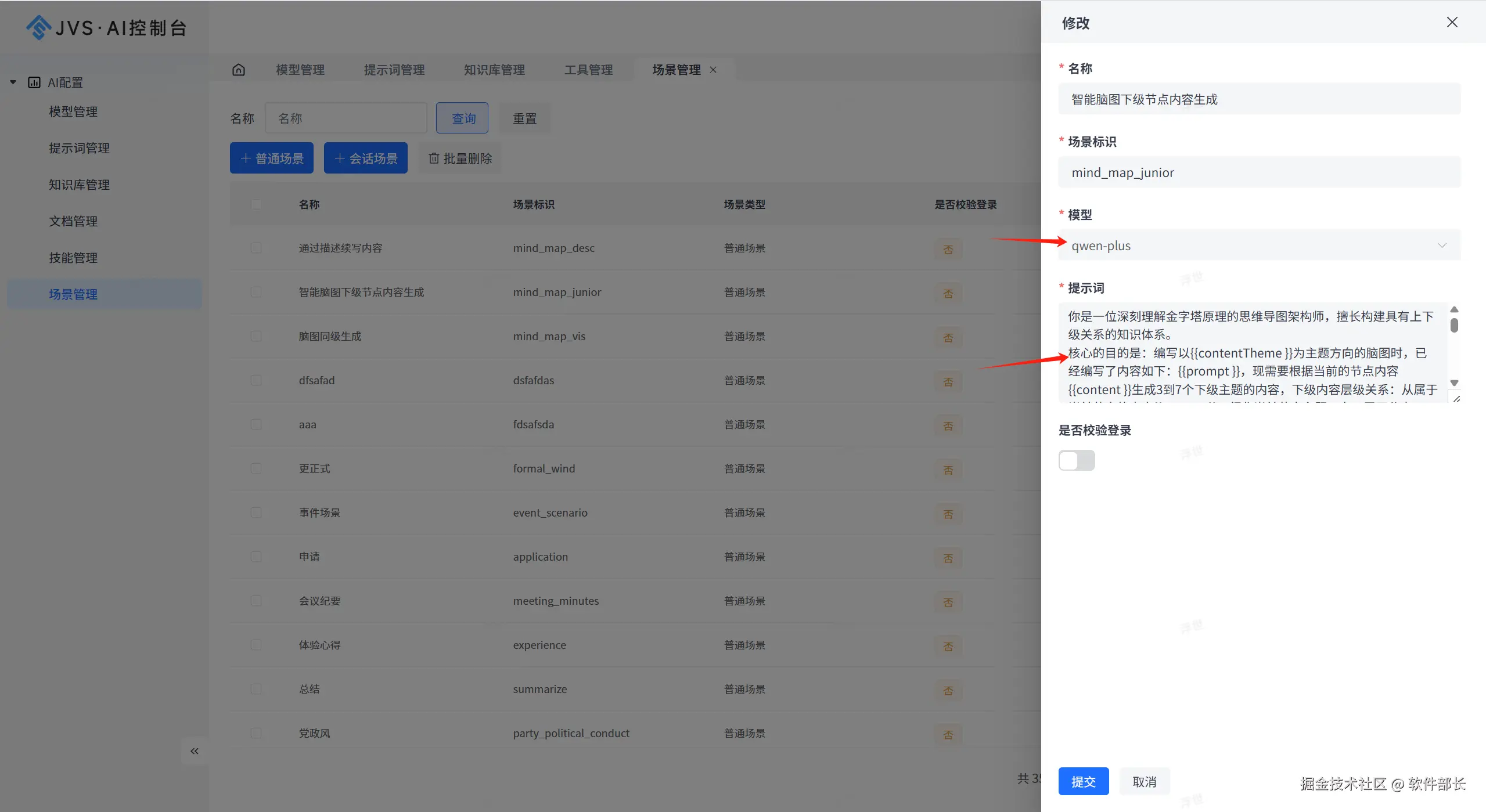 点击模型的设计,可以配置使用的模型、相关的内容生成的提示词: