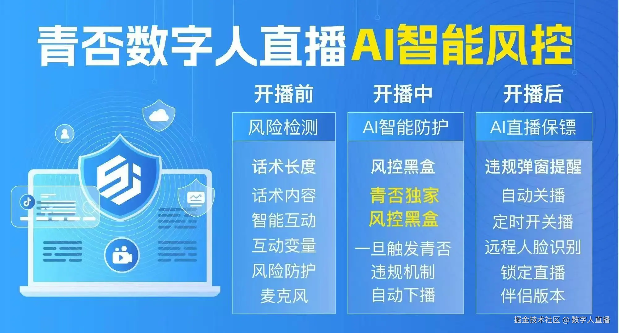 独创的AI 直播保镖能自动识别违规提醒、完成远程人脸验证等三大防控机制!