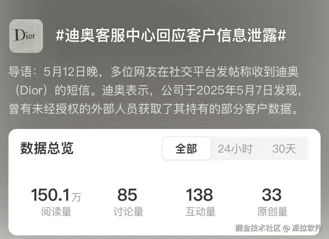 尽管迪奥强调未涉及财务数据,但事件仍引发消费者对隐私安全的强烈担忧,并登上微博热搜。