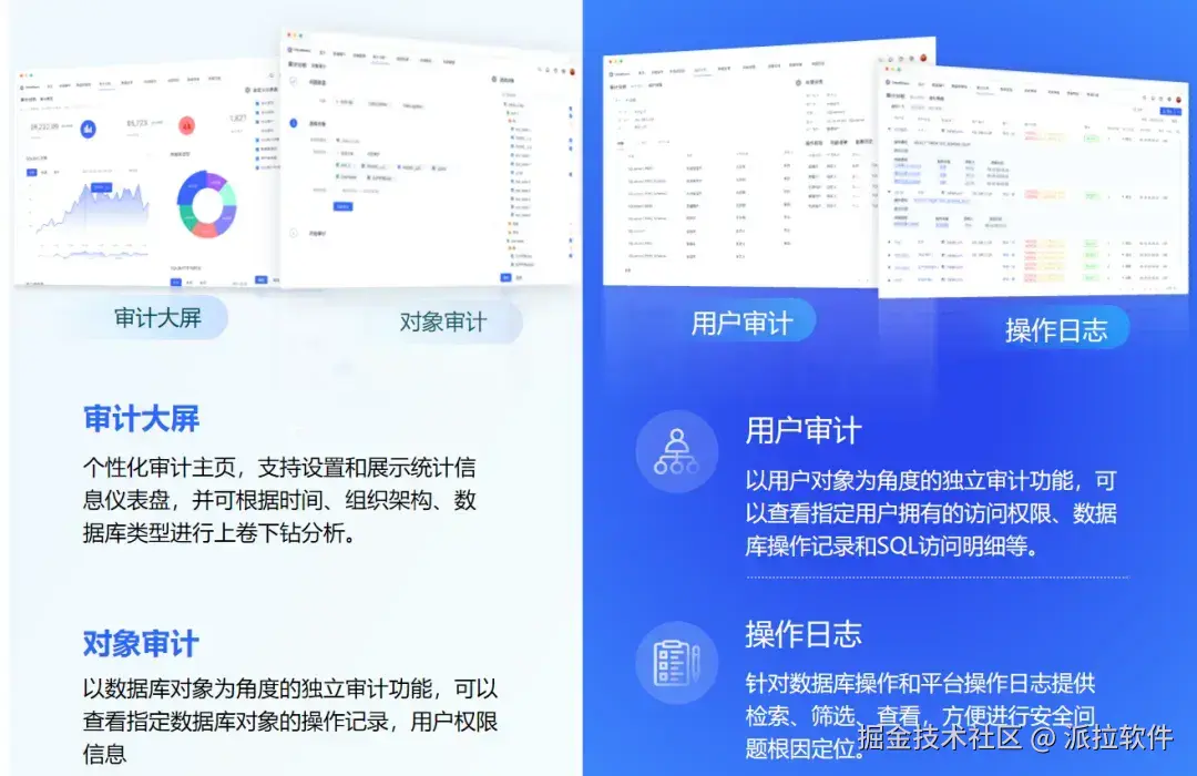区别于传统数据库审计产品,平台基于平台底层接口获取的执行SQL语句,达到审计结果100%准确。