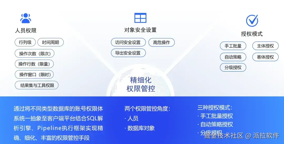 平台支持超级管理员、数据库管理员、审计管理员和数据库操作员等各类角色的功能授权;提供对数据库进行查询、删除、修改、数据导出、文件导入、SQL脚本收藏美化、结果集数据编辑等操作能力,实现用户、IP、表、行、列、SQL操作、语句、频次等30余种细粒度权限管控。