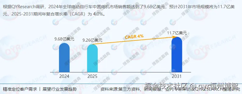 当前规模:根据QYResearch最新调研报告显示,2024年全球销售额达9.68亿美元,预计2031年增至11.7亿美元,CAGR为4.0%(2025-2031),增速低于电动自行车整体市场(6.8%),但高端市场(>250W)CAGR或达6.2%。