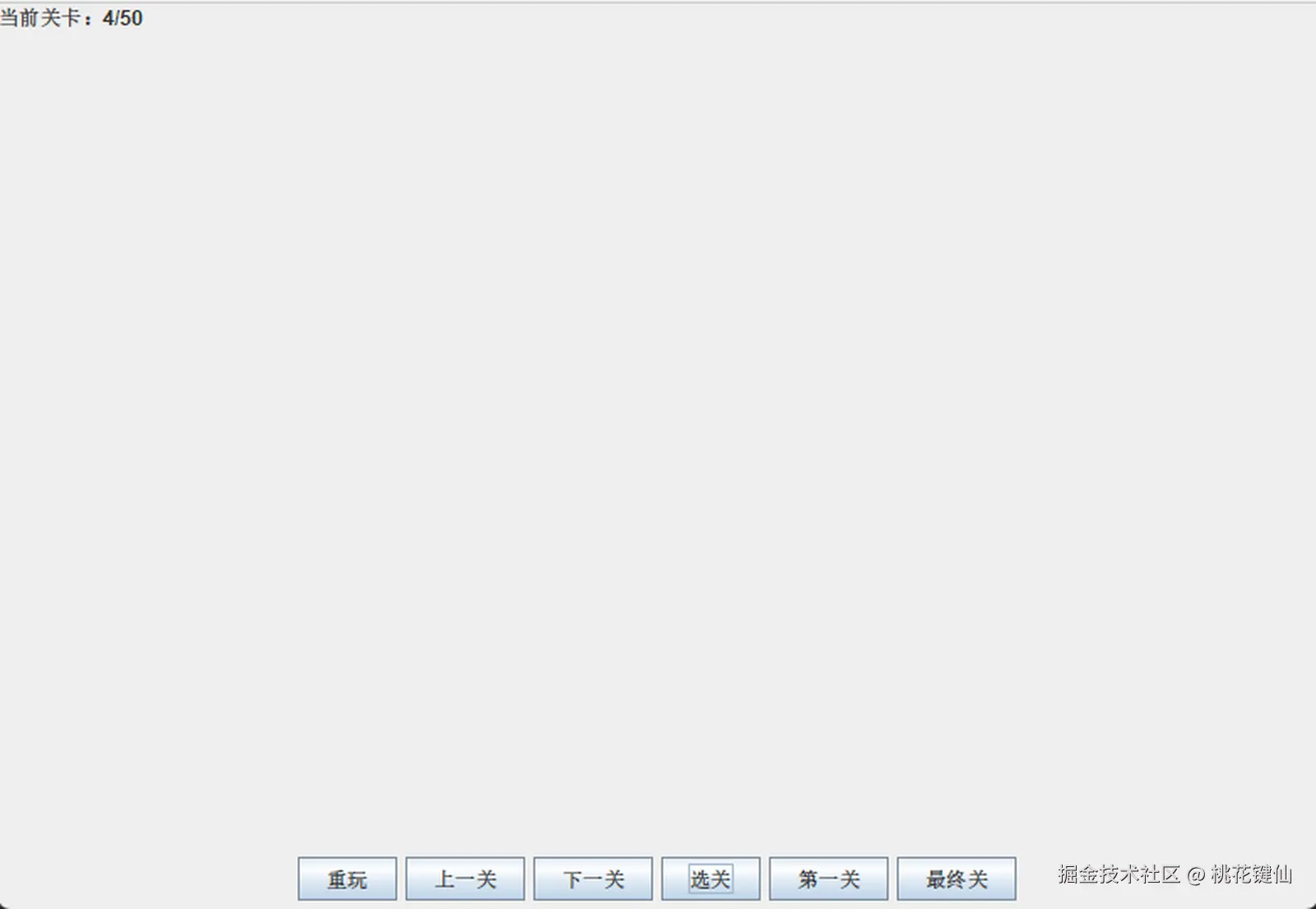 主窗口:包含菜单栏、操作按钮、游戏信息标签和游戏主面板。菜单栏:提供“重新开始”“上一关”“下一关”“选关”“退出”“关于作者”等功能。操作按钮:提供“重玩”“上一关”“下一关”“选关”“第一关”“最终关”等功能。游戏主面板:显示游戏地图和当前关卡信息。
