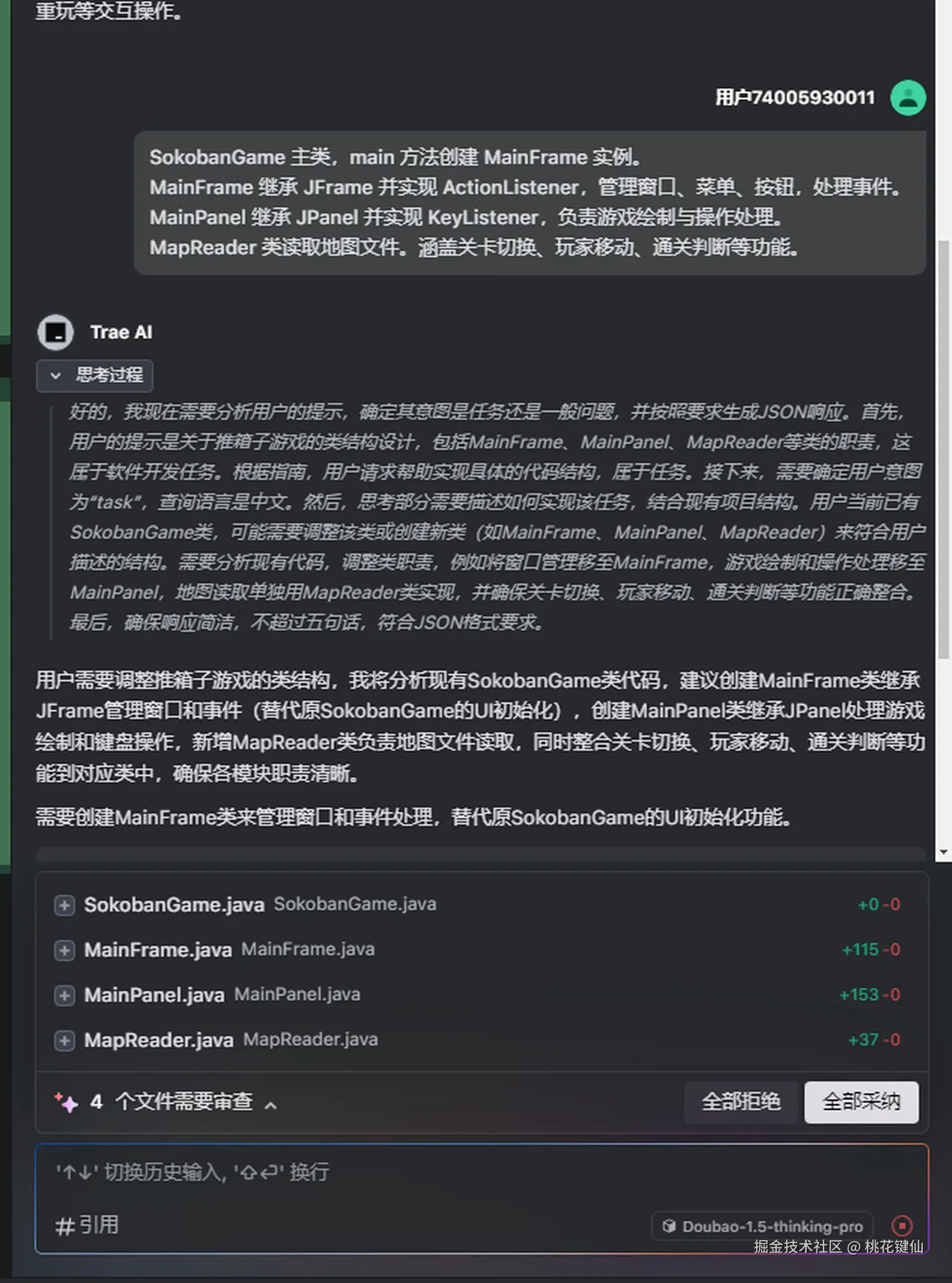 使用 Trae 插件的 Builder 模式开发端午包粽子小游戏,整体上是一种新奇且高效的体验。在项目初始化阶段,仅用一段自然语言描述,就能快速搭建起游戏的基本框架,这在以往的开发实践中是很难想象的。它极大地节省了搭建项目基础架构的时间,让我们能迅速看到一个可运行的雏形,为后续的功能细化和优化打下了良好基础。