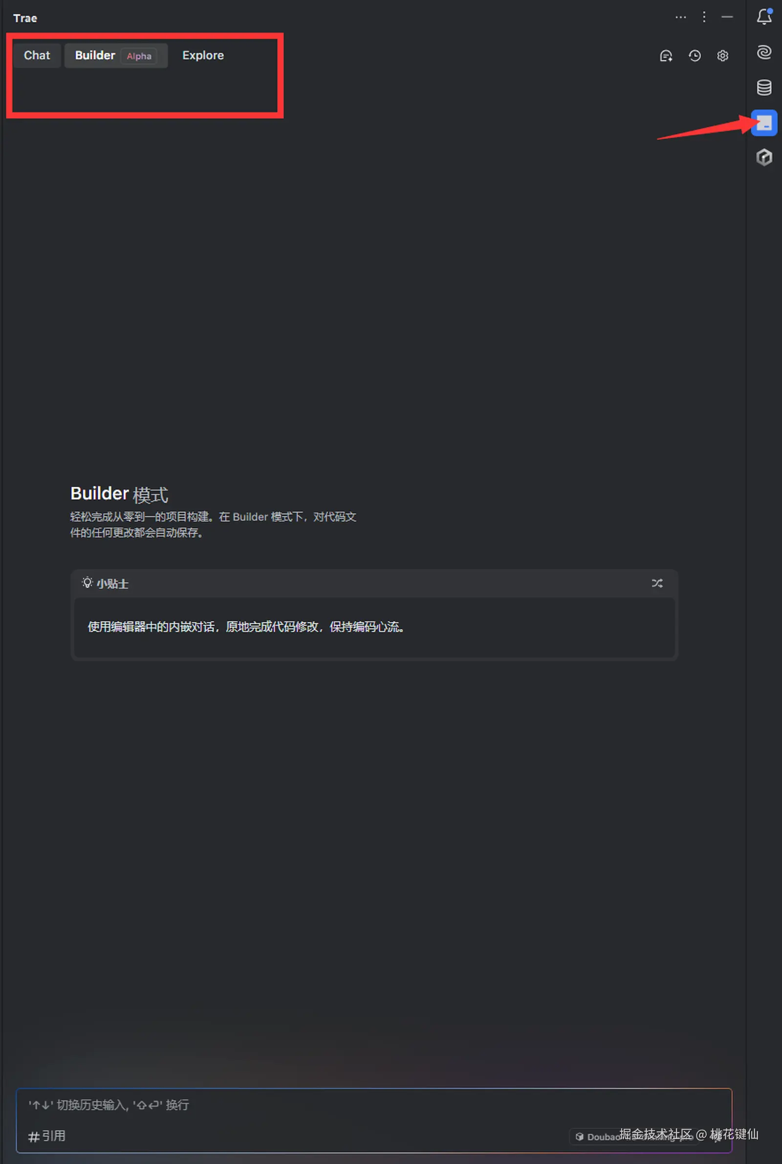 重启后单击右侧的图标就可以打开Trae了,默认的是Chat模式,我们选择Builder模式即可。(注意,第一次安装这里可能会出现没有红框中的这部分内容,不能选择模式。这种情况再重启一下IDEA就可以了。)