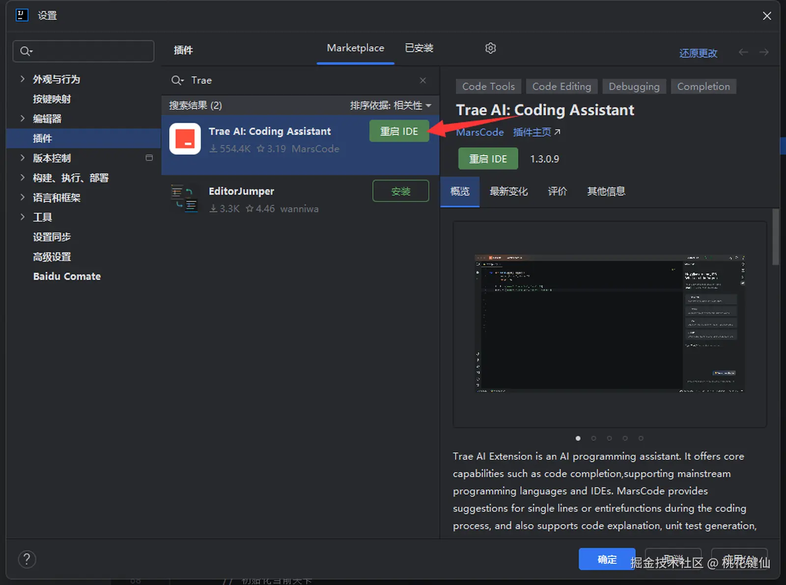 在弹出的对话框中单击“插件”,然后搜索“Trae”。选择搜索结果中的第一个,然后单击安装。(注意,这里可能会出现搜索不到任何东西的情况,这种情况一般是没连接上网络。确定网络没问题之后多刷新几次就好了)