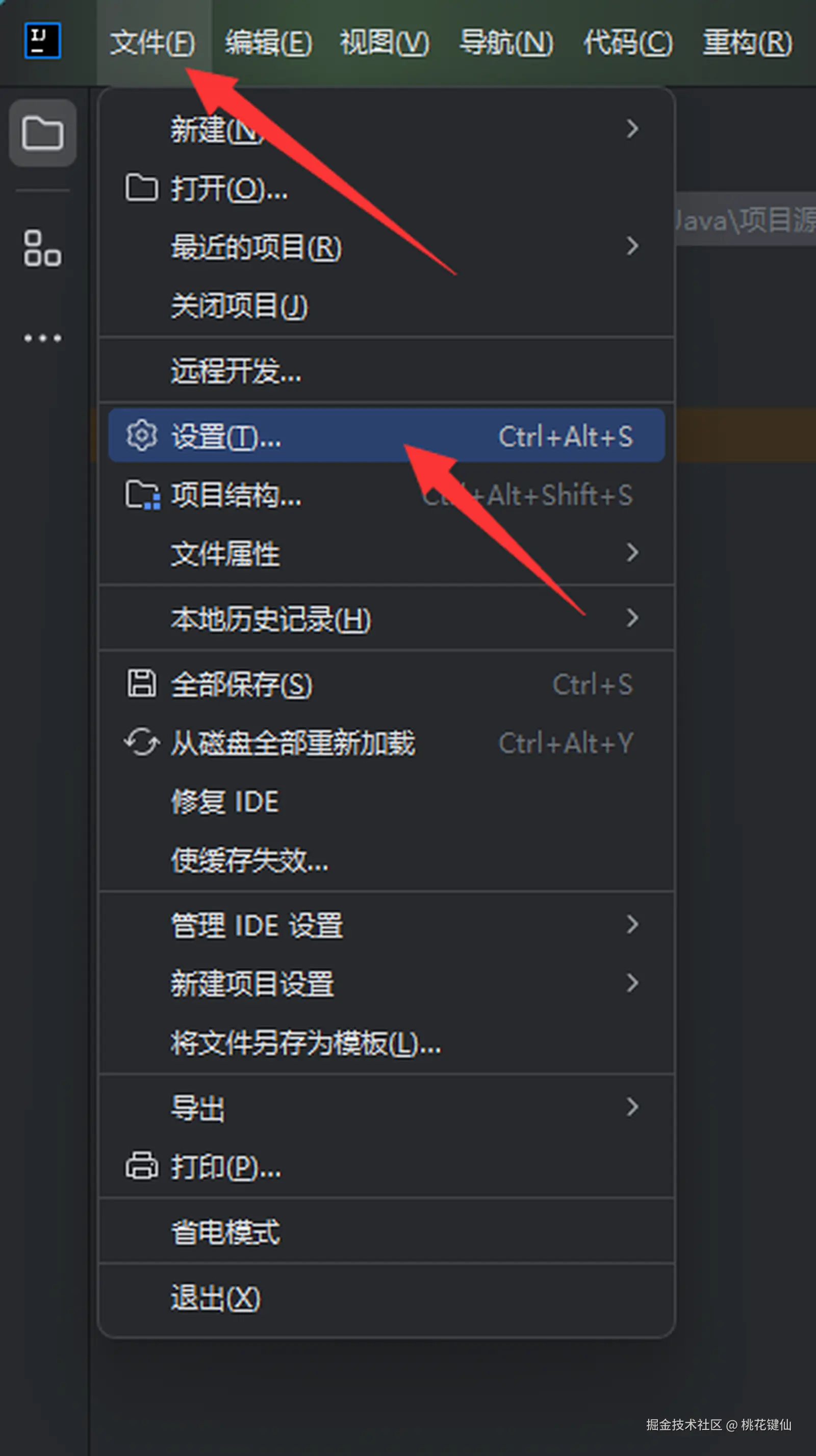 这里以IDEA为例,首先点击左上角“文件”,然后选择“设置”。