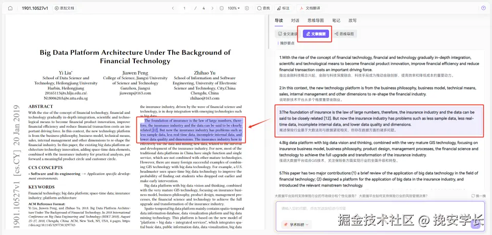 通过强大智能的算法能将文献的重点以文章摘要的形式可视化呈现,五大要点一一排列,点击每一个摘要即会跳转至原文,高亮显示对应段落,便于我们对照式参考阅读。