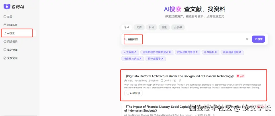 获取到全文之后,如何快速提炼出文献的精华内容?包阅AI速读文献功能将解决这一难题。只需几秒就能提取出这篇金融科技文献的研究学科类型,关键学术词,研究概述和研究要点。