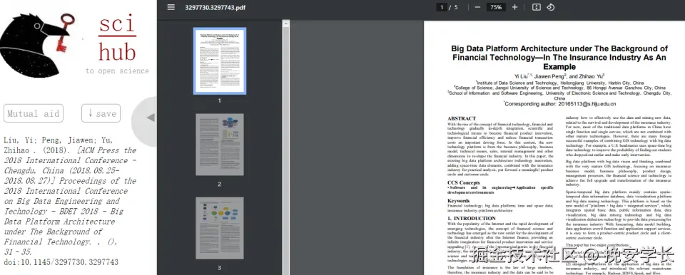 这时,我们可以利用包阅AI来查找自己需要的文献,输入“金融科技”关键词,他会清晰地展示与之相关的文献,无需下载,直接查看文献pdf,我们能够在第一时间获取到文献的DOI,记录下文献DOI,为下一步查找全文做好准备。