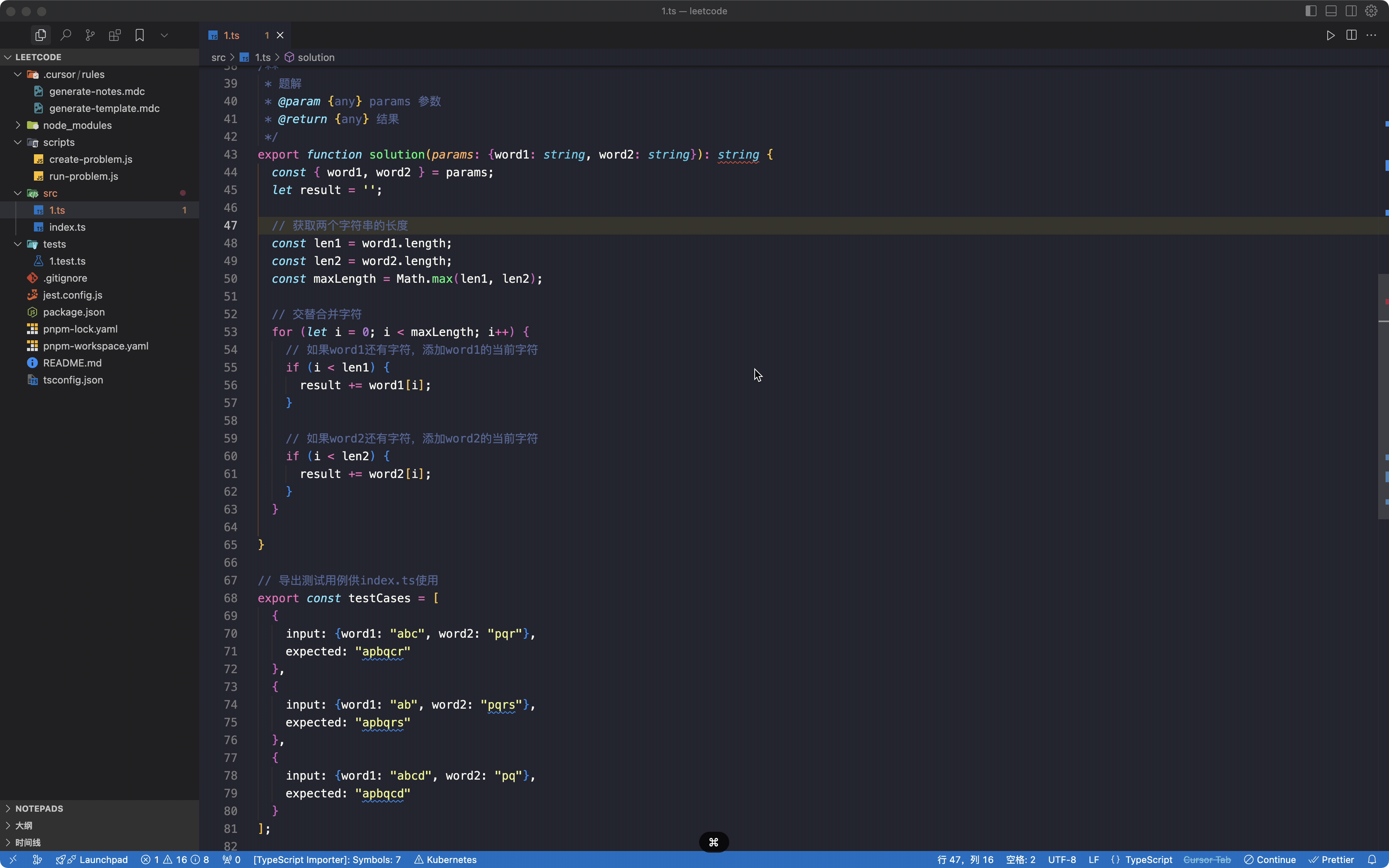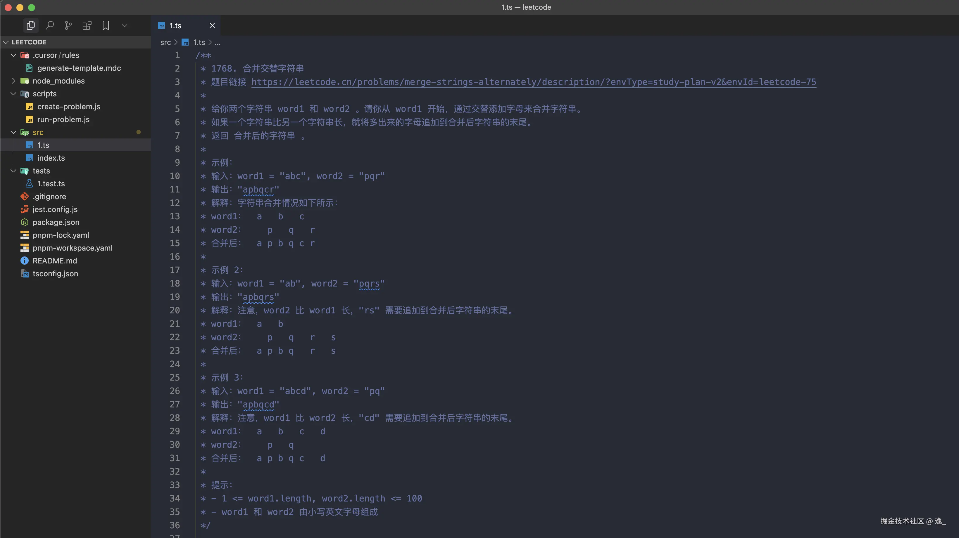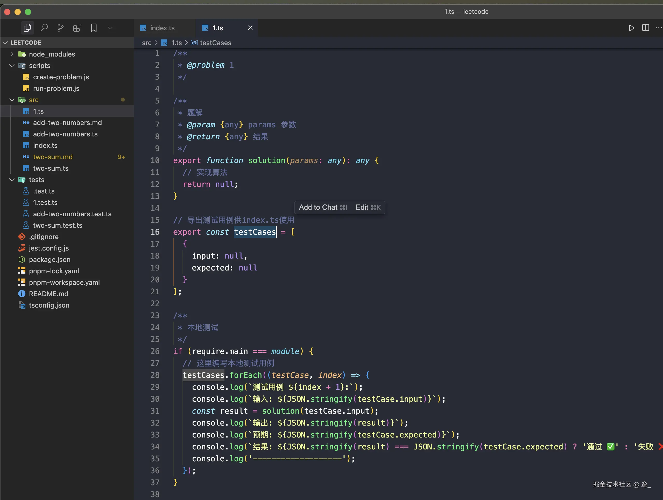 - 每个题目一个单独的文件,例如 `two-sum.ts`