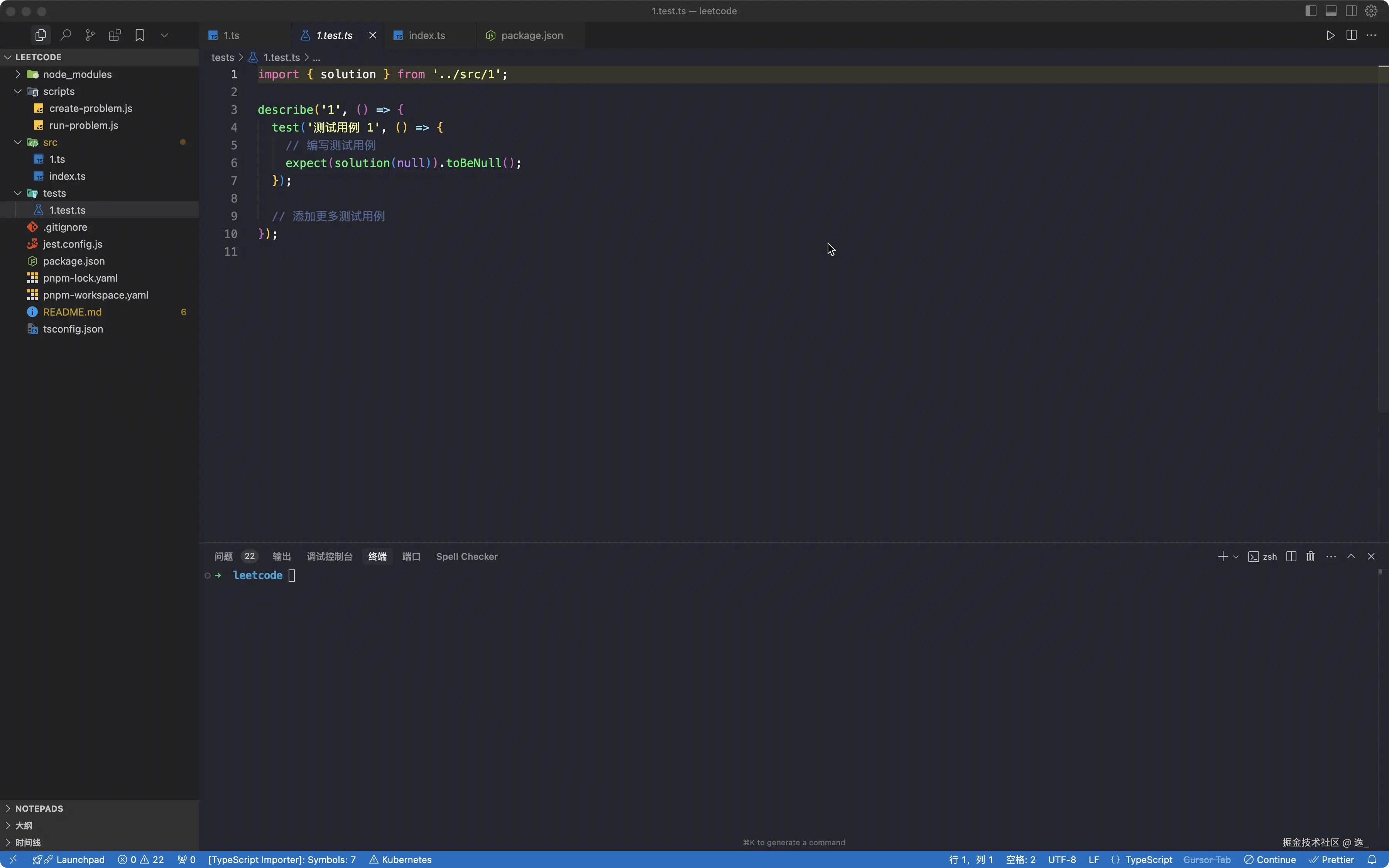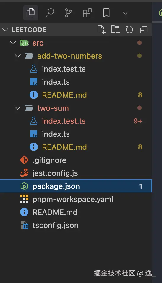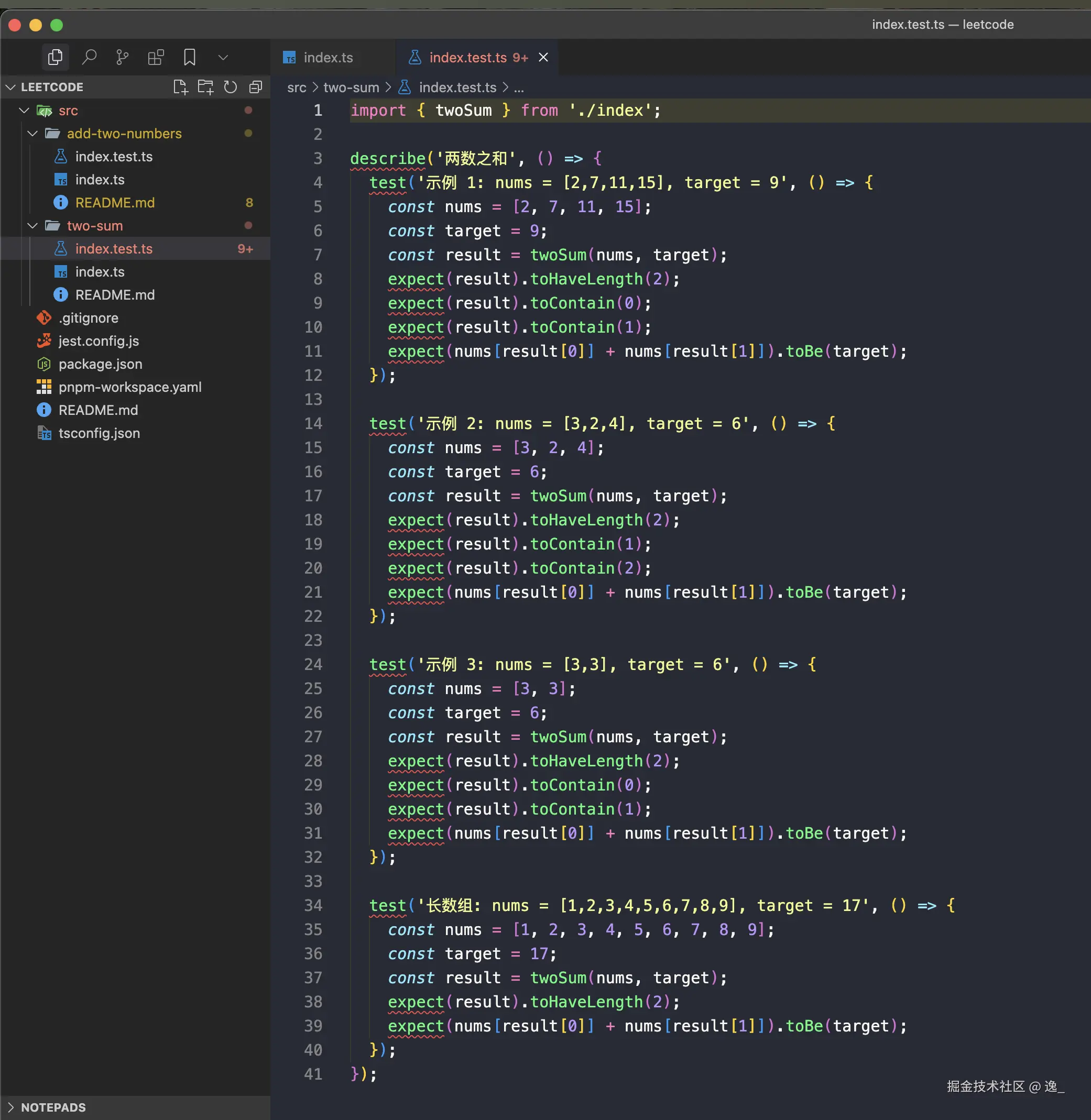 - 每个题目对应一个测试文件,例如 `two-sum.test.ts`