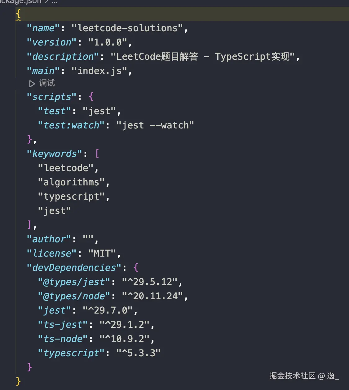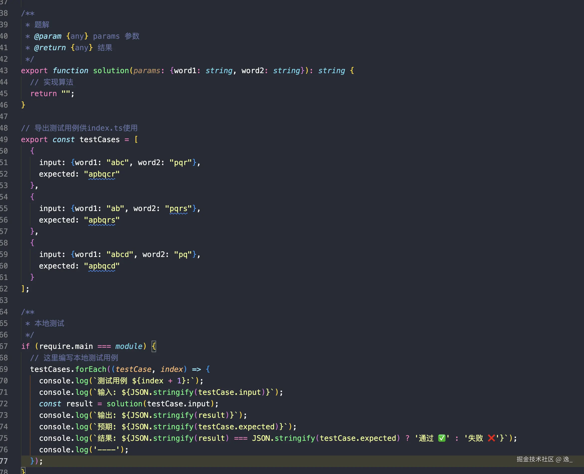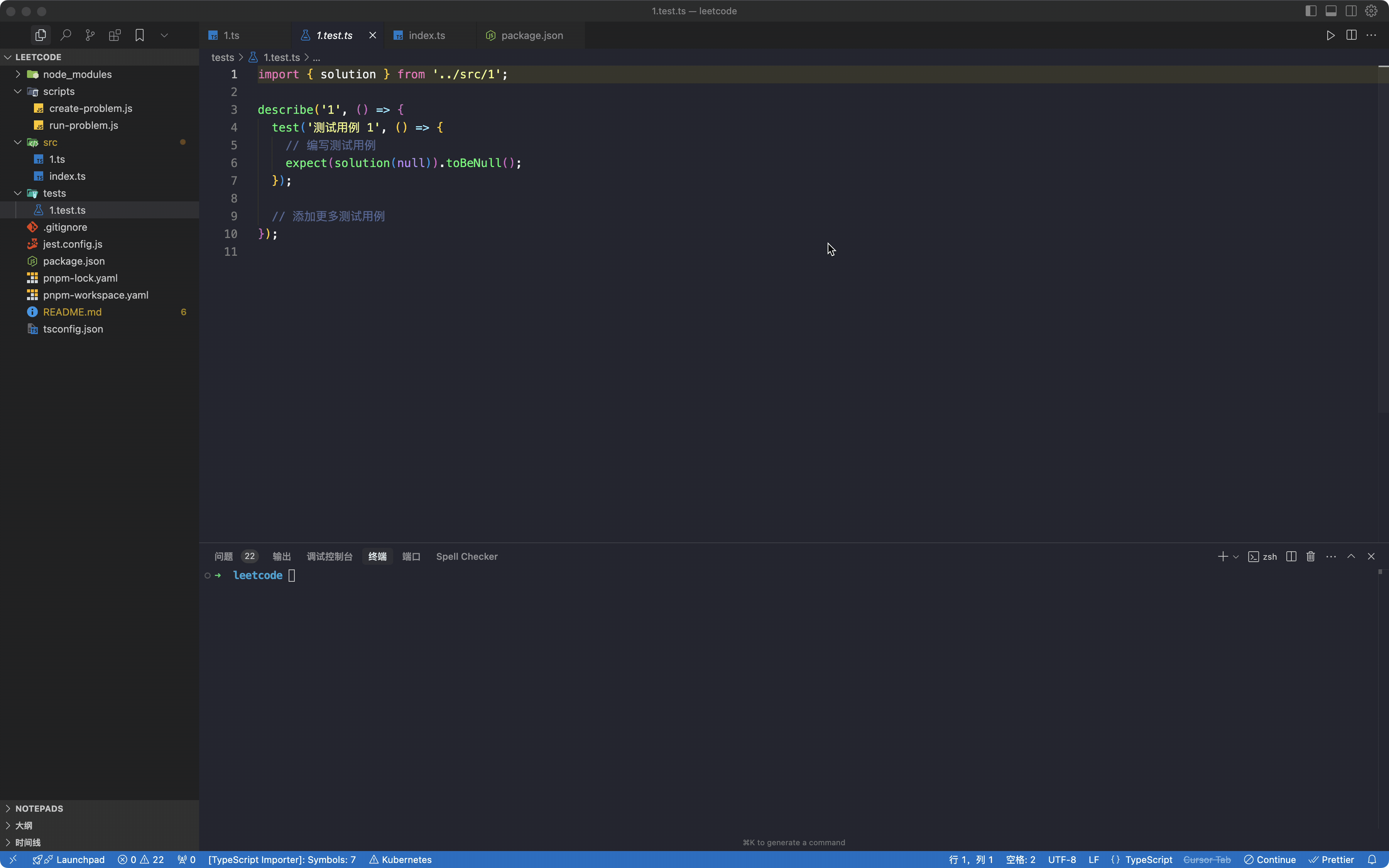 - 每个题目对应一个测试文件,例如 `two-sum.test.ts`