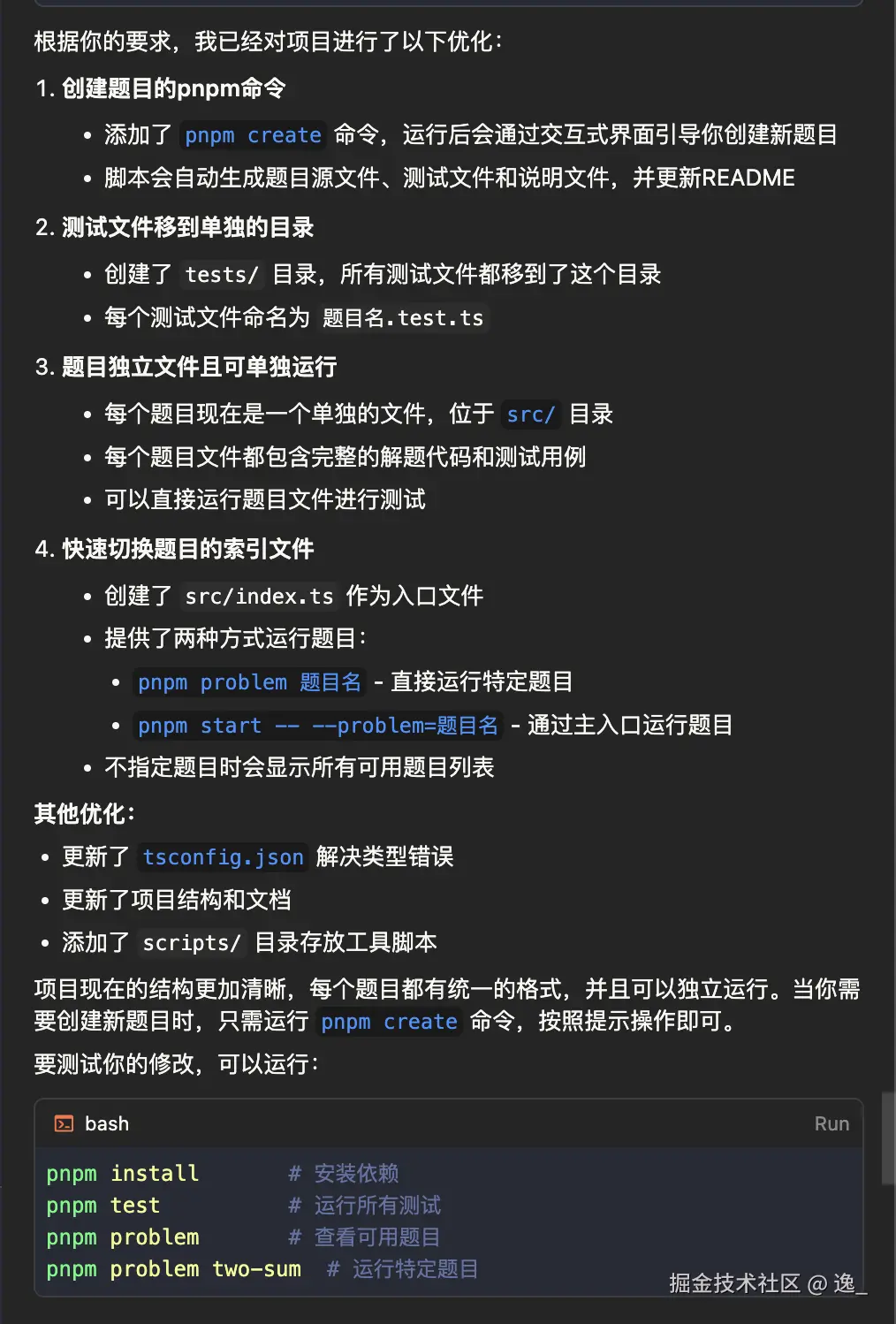 需要优化下项目,第一个我需要我有一个pnpm命令能够快速的创建一个题目,第二个就是把单元测试全部移动一个一个单独的文件夹,第三个就是题目都是一个文件并且这个文件能够单独的跑服务, 第四个我需要一个index文件能够快速的去切换题号做本地测试
