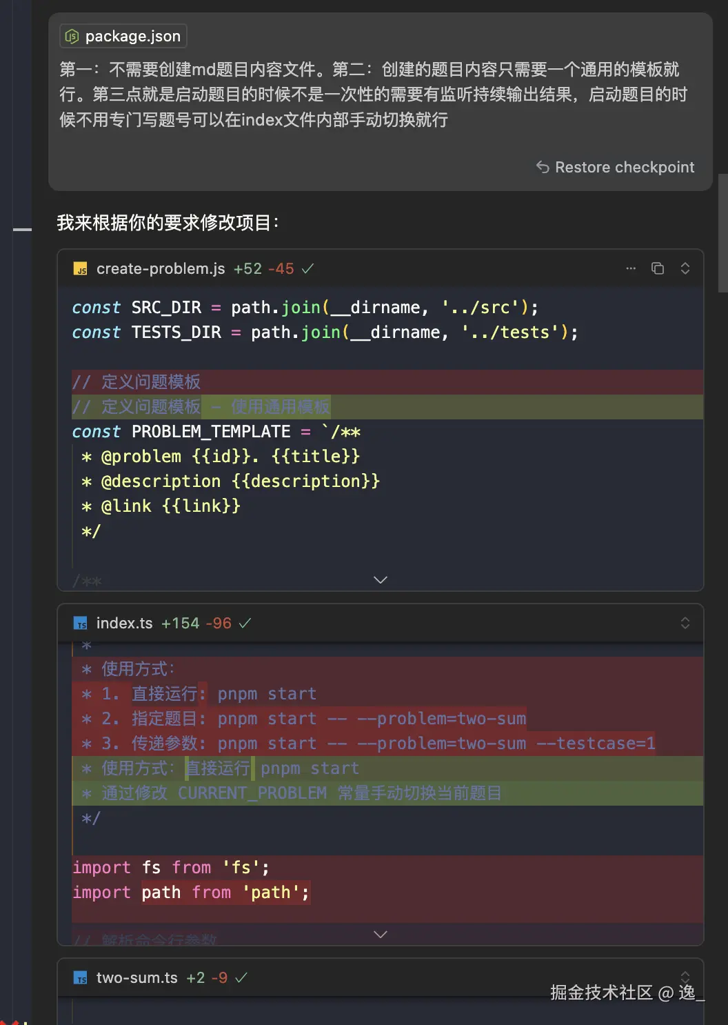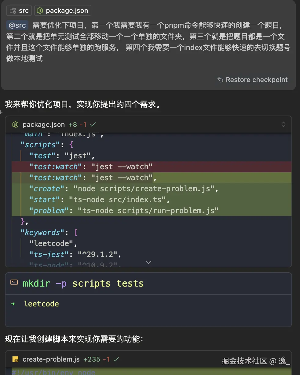 具体内容如下:新增了三个命令,create用来创建题目,start用来跑单个题目,problem用来看现在的题目列表,但是目前还有几个问题,start跑的题目是单次的不是监听和实时刷新形式的这样不利于我们解题中间的调试,创建的文件需要我们输出题号什么的其实没有那么复杂只需要创建一个简单的模板就行,后面有别的方法在文件里面创建题目内容,还有就是md文件名没什么用直接放到ts文件注释里面就行,我继续优化