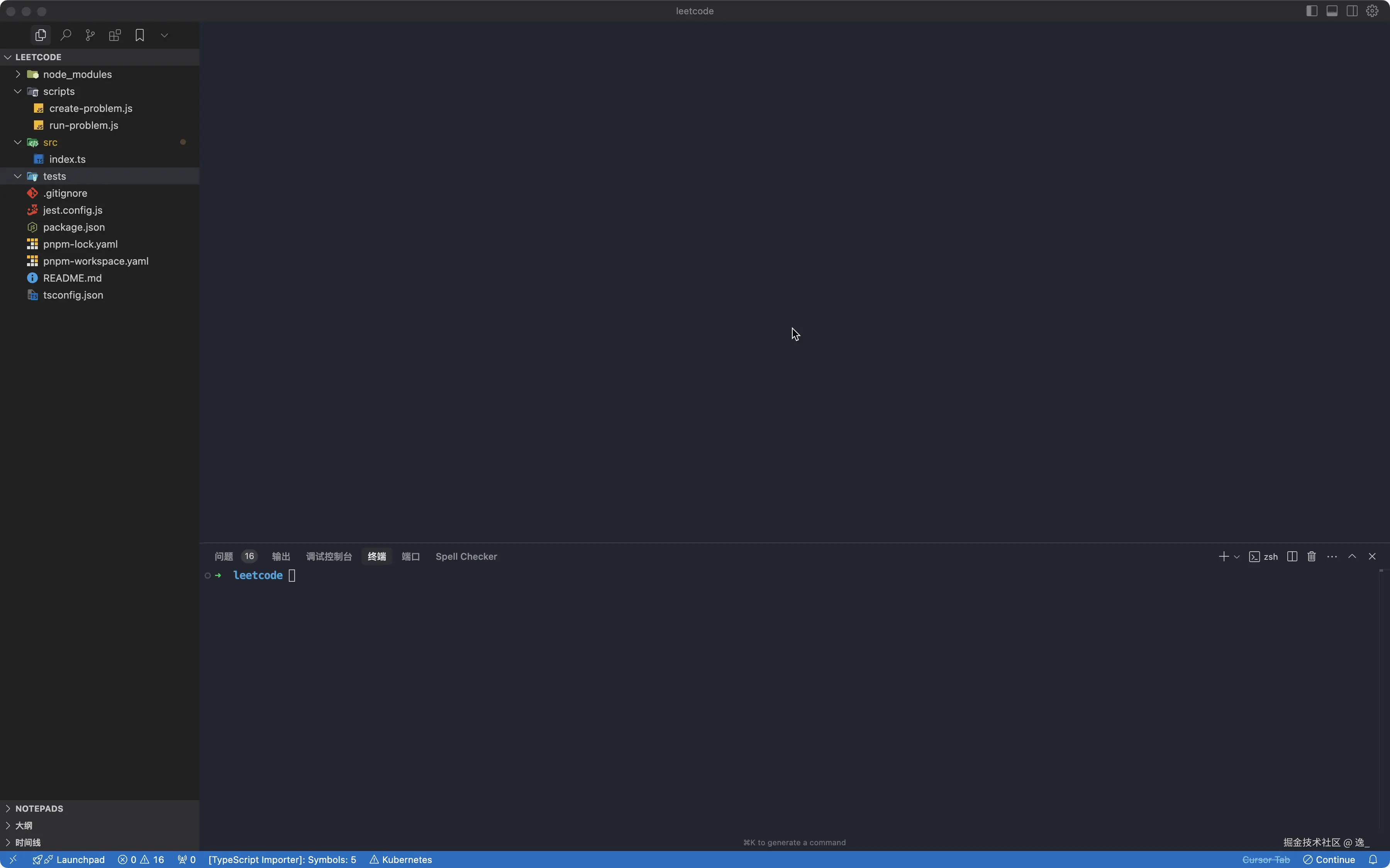 具体输出内容如下图,创建一个开发项目,这个生成目录主要是一个题目一个文件夹,只用jest作为测试,他把题目搞成一个md文件,测试用例一个文件,解题一个文件,这个还不是我最满意的状态,继续优化工程项目。