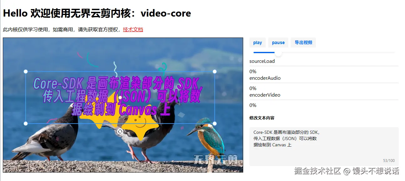 这里介绍的视频渲染内核主要基于webcodes + ffmpeg + webgl + react 开发,Core-SDK 是画布渲染部分的 SDK,传入工程数据 (JSON)可以将数据绘制到 Canvas 上。可基于该 SDK 进行二次开发,开发视频相关的小程序,H5,PC视频编辑器等基于 web 的在线工 具。