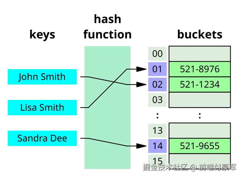 key: "apple" → 哈希函数 → index: 2 → 存在数组[2]位置