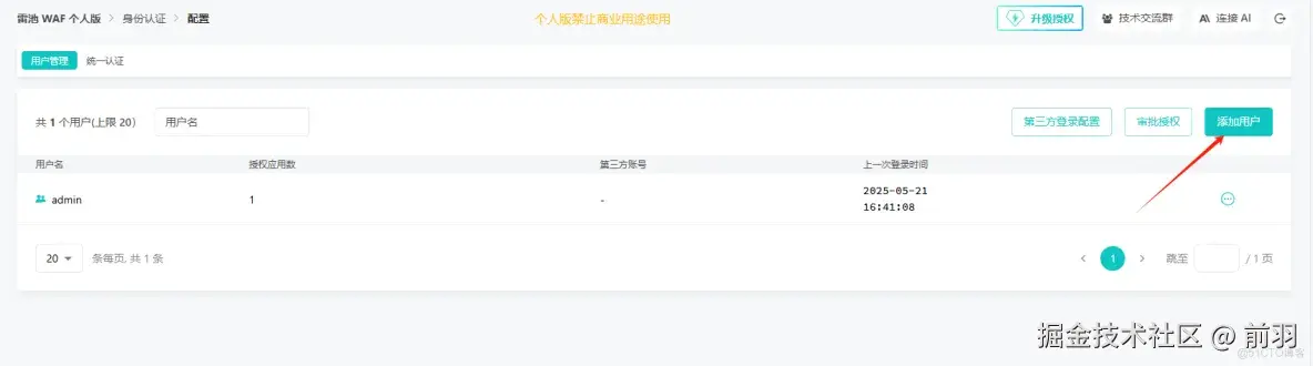 这里我选择了最最方便的本地认证来演示一下。雷池功能强大,支持多种认证方式。如:提供多种登录方式可供选择,包括账号密码、钉钉、企业微信、OIDC、GitHub、微信扫码登录、CAS、LDAP。统一认证模式下需前往身份认证-配置-统一认证进行配置。