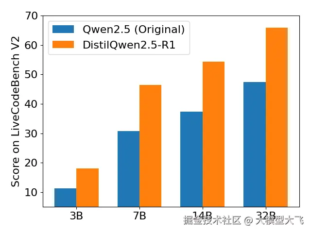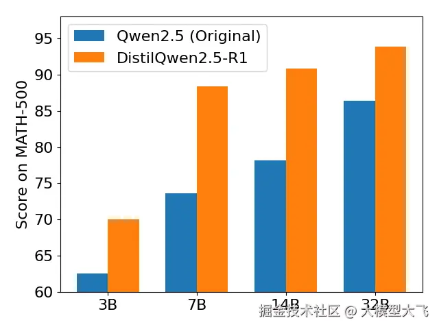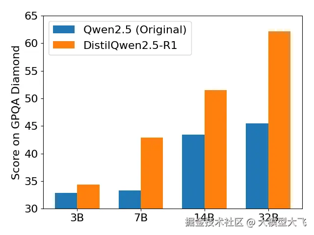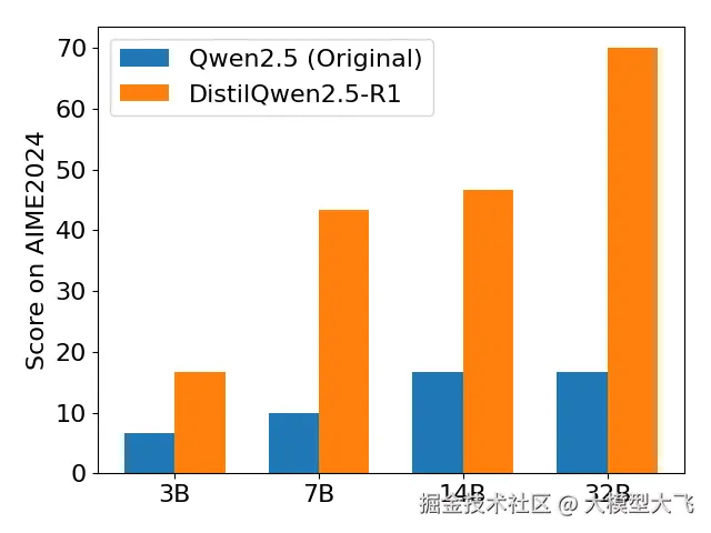 | 模型 | 训练数据量 | AIME2024 | MATH-500 | GPQA Diamond | LiveCodeBench V2 | | --- | --- | --- | --- | --- | --- | | DeepSeek-R1-Distill-Qwen-32B (reported) | 800k | 72.6 | 94.3 | 62.1 | - | | Sky-T1-32B-Preview (reported) | 17k | 43.3 | 86.4 | 56.8 | - | | OpenThinker-32B (reported) | 114k | ++66.0++ | ++90.6++ | ++61.6++ | 68.9 | | DistilQwen2.5-R1-32B | 105k | 70.0 | 93.8 | 62.12 | ++65.95++ |