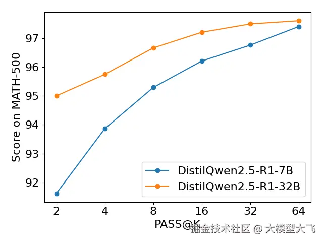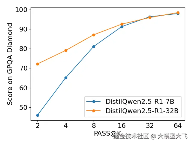 可以看出,随着模型推理次数 k 的逐步增加,两个模型在所有基准上的评测准确率大幅提高。值得注意的是,随着 k 的增加,DistilQwen2.5-R1-7B 在 MATH-500 和 GPQA-Diamond 上涨幅巨大,并且不断逼近 DistilQwen2.5-R1-32B 水准。这表明我们的推理模型训练框架在小模型领域内拥有巨大潜力。我们可以通过多次推理的方式使 7B 模型拥有媲美 32B 模型的能力,极大减少了推理所需的计算资源。