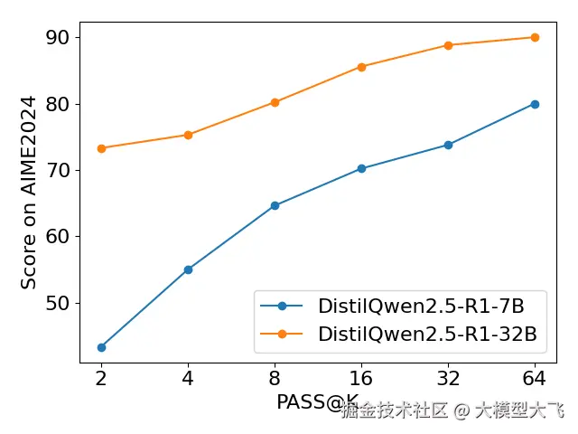 我们还测试了 DistilQwen2.5-R1 系列模型在上文提到的四个基准上多次推理的结果,模型会对同一个问题生成 k 个回答进行评测,即 Pass@k 指标。以下是 DistilQwen2.5-R1-7B 和 DistilQwen2.5-R1-32B 在四个基准上 Pass@k 结果(k=2、4、8、16、32、64)。
