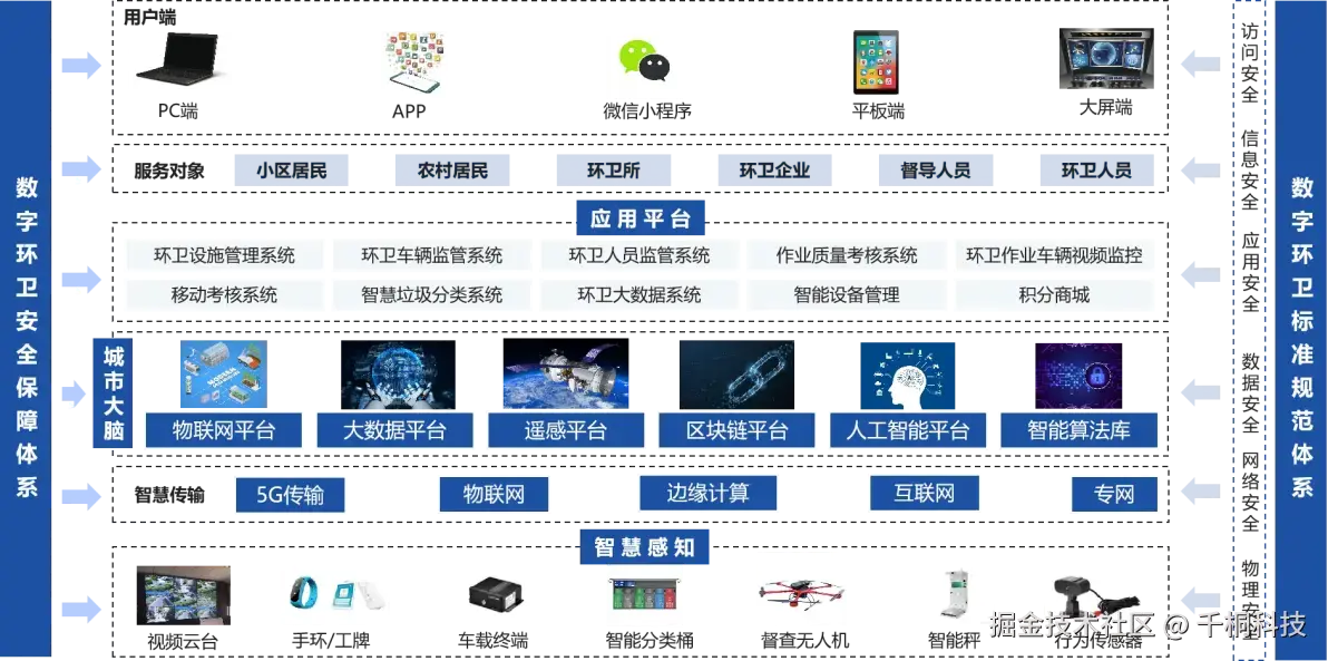千桐科技基于多年政府信息化、智能化项目经验,结合城市管理发展趋势,重磅推出“千桐智慧环卫解决方案”,通过物联网、云计算、大数据、人工智能、区块链等新一代信息技术,构建覆盖“人、车、物、事”的全场景、全流程、全链条数字化监管体系,助力城市环卫治理精细化、智慧化、高效化转型升级。