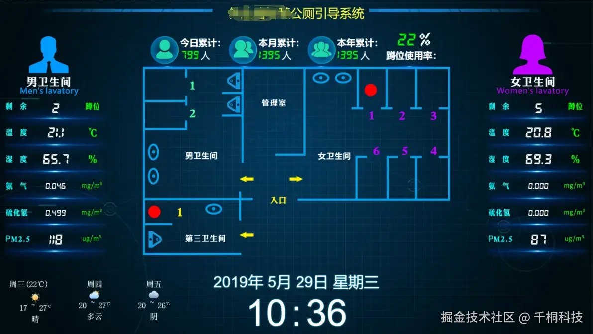 通过空气质量监测、客流统计、智能照明、厕位引导、一键求助、安全预警等系统,构建智能感知与人性化服务一体化的数字公厕新体验,提升群众满意度。