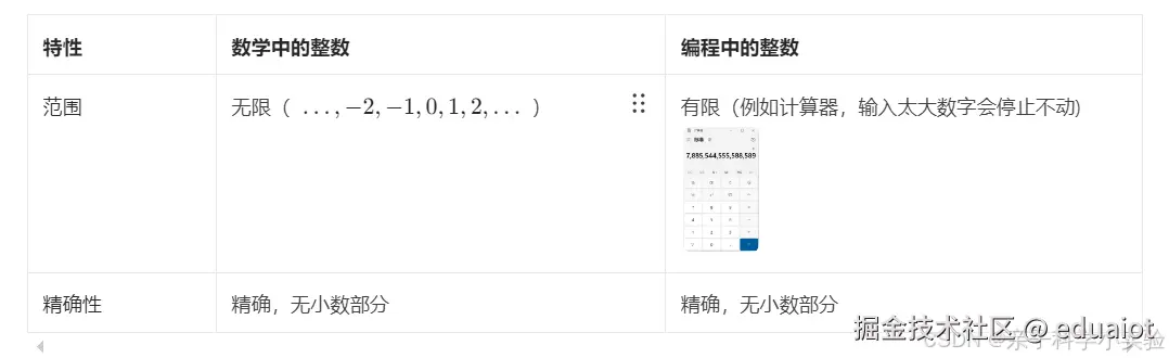 | 概念 | 计算机存储和运算格式 | 数轴上的数,可无限精确 |