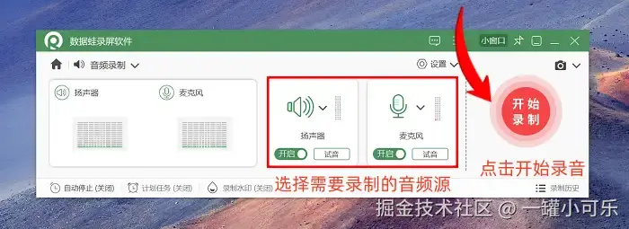 其中数据 蛙录屏软件拥有专业音频录制模式,可以录制无损质量音频。操作上,软件界面简洁,声音设置灵活,不仅能轻松调节麦克风和扬声器音量,还具备麦克风降噪与增强功能,能够有效提升录音清晰度。