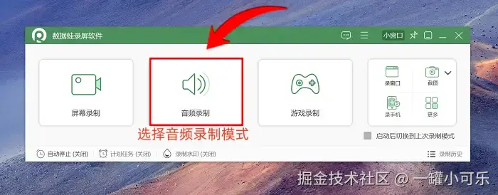 步骤1:视频录音怎么录?打开数据 蛙录屏软件,然后可以看到在软件主界面上,有多种录制功能,我们选择中间的 “音频录制” 模式。