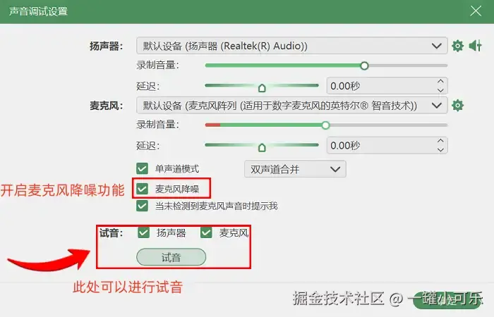 步骤2:在音频录制模式中,可以打开或关闭麦克风和扬声器,并对它们的音量进行调节,根据自己的实际需求进行设置。如果只想录制电脑内部播放的声音,就打开扬声器,关闭麦克风;如果要录制自己的讲解声音,就打开麦克风。我们还可以在 “声音输出设置” 中,打开麦克风降噪功能。设置好后,就点击 “开始录制” 。
