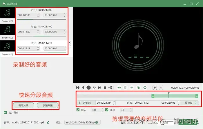 步骤3:录音结束后,软件会弹出录音预览,如果对录音效果不满意,可以重新录制或在 “高级剪辑” 中对录音进行修剪。