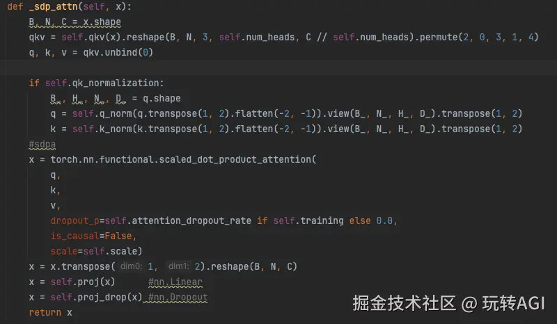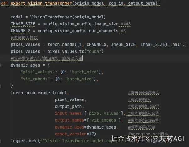 Exporting the operator 'aten::fft_rfftn' to ONNX opset version 17 is not supported这时需要调整模型网络结构或者自定义算子。在对 ViT 模块进行 ONNX 转换过程中,部分多模态模型的 ViT 中使用了 FlashAttention2 进行注意力加速,而 FlashAttention2 中的 flash_attn_func 是作为独立的内核实现的,不是 torch.nn.Module 的实例,导致导出器无法捕获计算图,如下:/usr/local/lib/python3.10/dist-packages/flash_attn/flash_attn_interface.py:90: TracerWarning: Converting a tensor to a Python boolean might cause the trace to be incorrect. We can't record the data flow of Python values, so this value will be treated as a constant in the future. This means that the trace might not generalize to other inputs! 因此,对 Attention 模块进行了调整,使用 PyTorch 内部实现的缩放点积注意力(Scaled Dot-Product Attention, SDPA),如下图,至此模型便可成功转换成 ONNX 格式。图 8 : 缩放点积注意力 (SDPA) 代码截图2、模型优化该阶段主要完成模型优化,如下图所示,在模型优化过程中会完成层间融合,精度校准等。这一步的输出是一个针对特定 GPU 平台和网络模型的优化过的 TensorRT 模型,这个 TensorRT 模型可以序列化存储到磁盘或内存中,存储到磁盘中的文件为 TensorRT planfile。