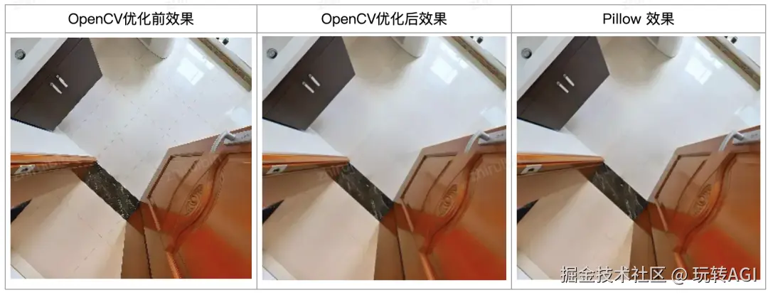 To shrink an image, it will generally look best with INTER_AREA interpolation, whereas to enlare an image, it will generally look best with INTER_CUBIC (slow) or INTER_LINEAR (faster but still looks OK).于是我们根据不同的图像采样对插值方式进行动态调整,对图像降采样时,使用 INTER_AREA 插值,上采样时,使用 INTER_CUBIC (速度较慢,但效果最好),调整后,Resize 结果如下:图 3:OpenCV 优化前后与 Pillow 效果对比