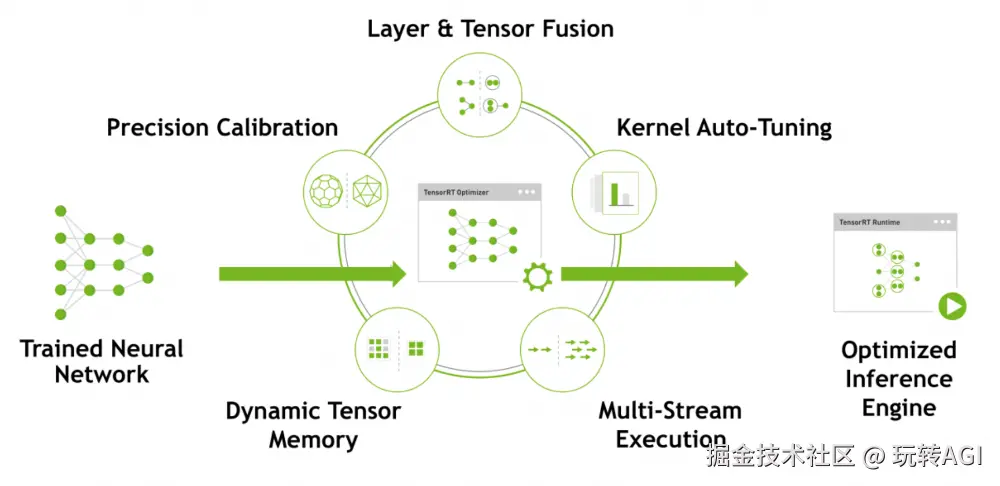 TensorRT 是一个高性能的深度学习推理(Inference)优化器,可以为深度学习应用提供低延迟、高吞吐率的部署推理。TensorRT 可对多种应用场景进行推理加速,并且支持 TensorFlow、Caffe、Mxnet、Pytorch 等几乎所有的深度学习框架。将 TensorRT 和 NVIDIA 的 GPU 结合起来,能在几乎所有的框架中进行快速和高效的部署推理。
