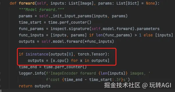 图 5:LMdeploy VIT 阶段内存拷贝代码截图经过验证,内存拷贝耗时主要是等待 GPU 异步处理结果,所以实际上主要耗时模块为图像预处理及特征提取两部分。具体定位步骤如下: