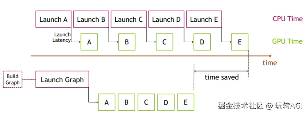 如下图,简单展示了 CUDA Graphs 的优势。在顶部,CPU 逐个启动一系列短内核。CPU 启动开销导致内核之间出现明显间隙。如果我们用 CUDA 图替换此内核序列,最初我们需要花费一些额外的时间来构建图并在第一次启动整个图时一次性启动整个图,但后续执行将非常快,因为内核之间的间隙将非常小。当多次重复相同的操作序列时,例如在许多训练步骤中重复,差异会更加明显。