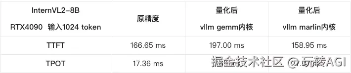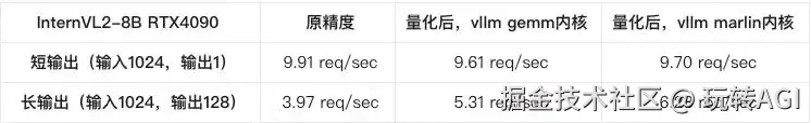 总结:在实际使用中对于 W4A16 量化后的模型来说,模型占用的显存一定能节省。但是推理的整体性能和吞吐量,需要根据不同的任务特点,部署的硬件环境,调整部署的参数,以达到最优。而不是量化后的整体性能一定会优于未量化的模型。