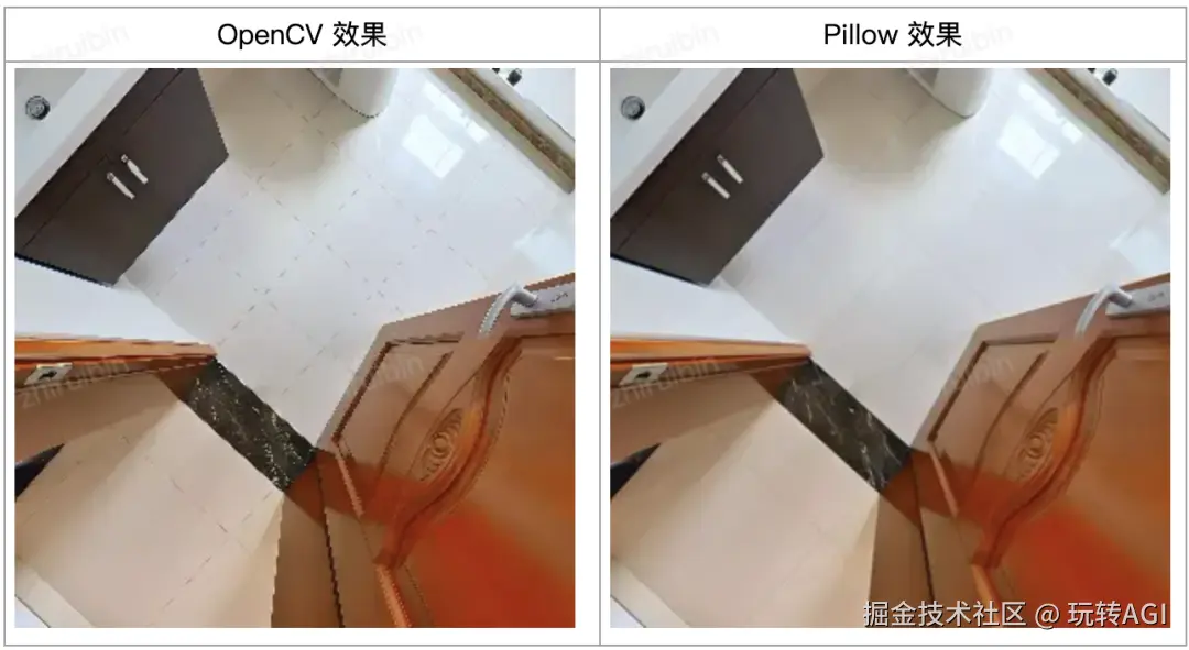 图 2:Pillow 与 OpenCV 效果对比通过对比源码实现,发现二者在插值与边界处理实现上有所差异:
