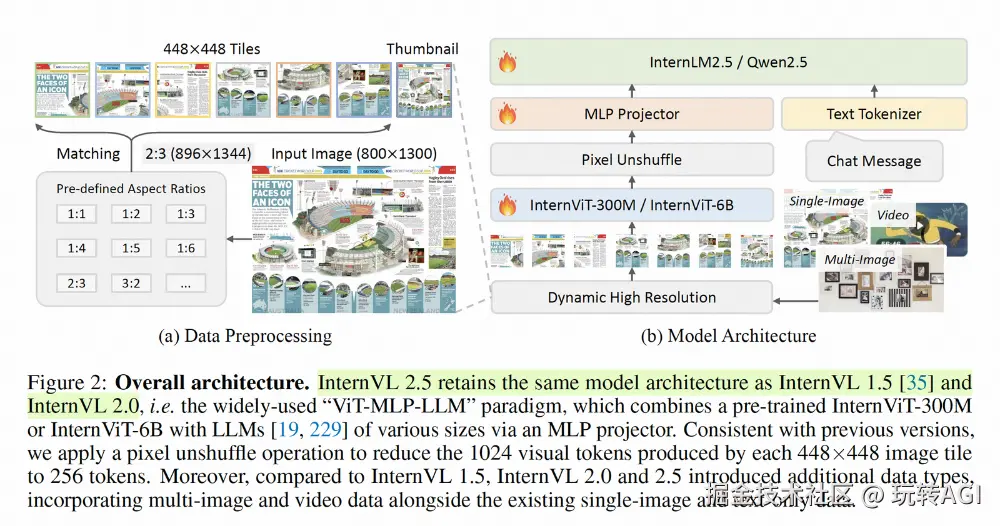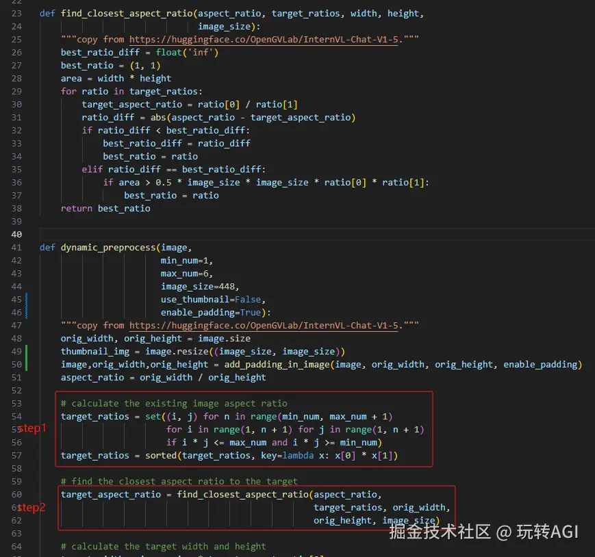 图 13:VLLM 中 InternVL2-8B 模型拆图代码截图 上述代码基本流程是,给定动态拆分的阈值范围,穷举出所有可能的目标比例,再根据原图比例匹配最佳的拆分规则,拆分逻辑图示如下图左上部分,图示中会被拆分成 6 个 path 块和一张缩略图。