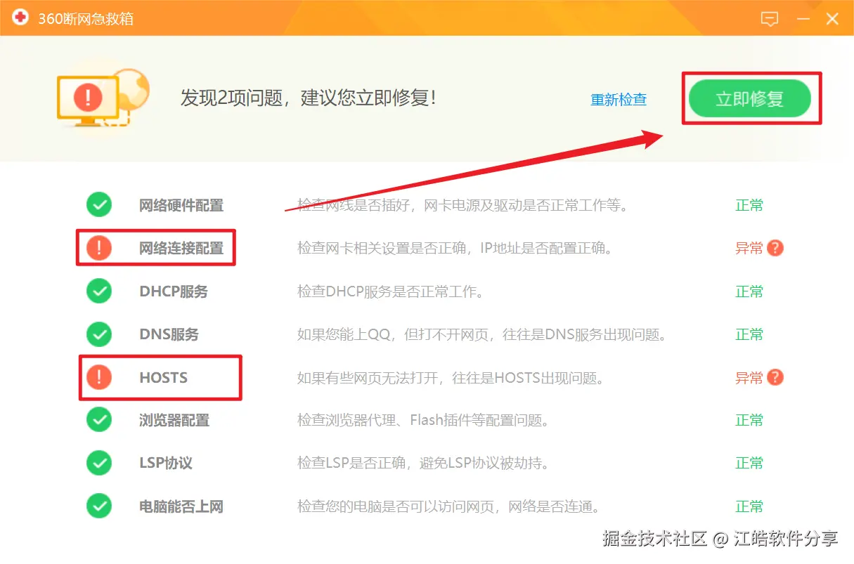 内置的网络诊断工具支持一键检测常见网络问题,如DNS解析、网关连接等。测试过程中发现其修复建议比较准确。