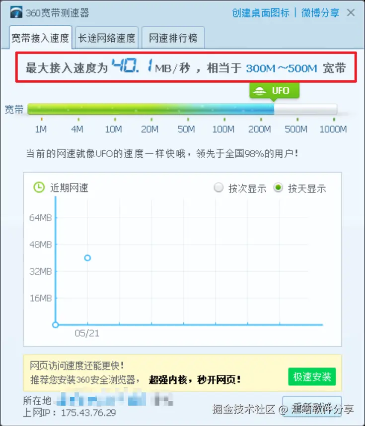 工具集成了简单的带宽测试模块,可以快速测量当前网络的上行/下行速度。测试结果与专业测速网站基本一致。